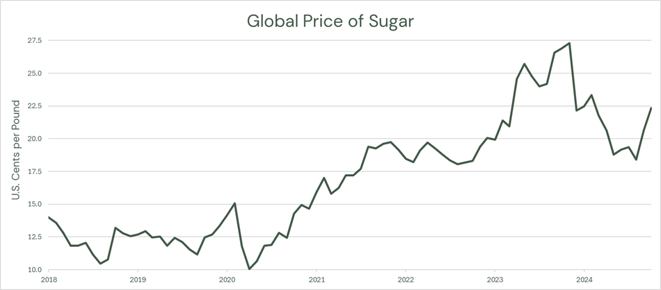 - Sugar prices, while experiencing a recent dip, remain on an upward trajectory and are still near a six-year high.